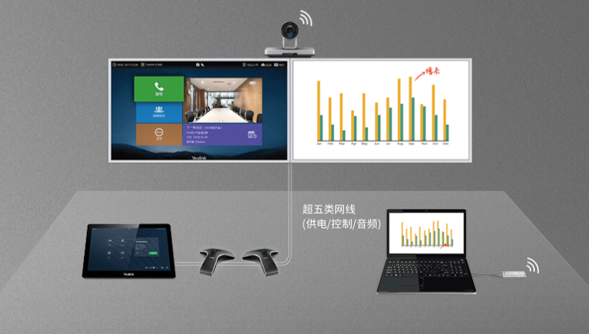 ? 只需一根超五類網(wǎng)線就可聯(lián)接電視區(qū)與會議桌,大大簡化了安裝部署,現(xiàn)有會議室不用改造就可升級成視頻會議室