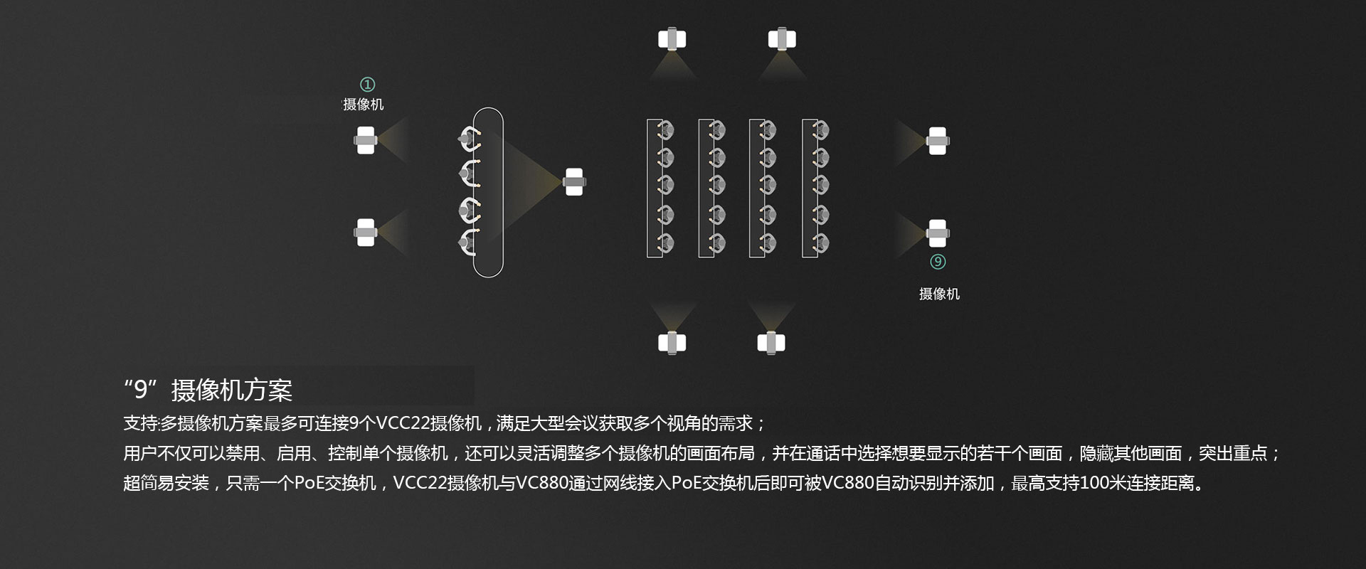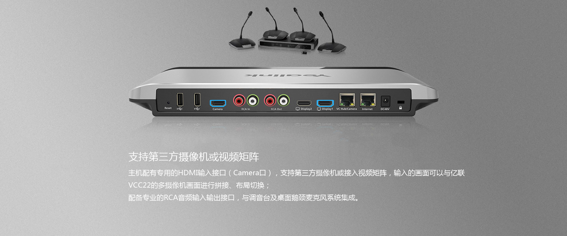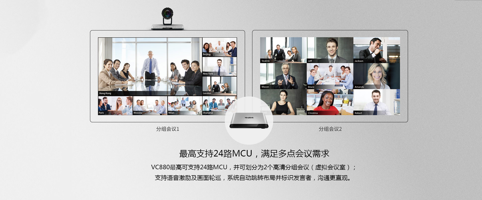 人像視頻質量:1080p60fps;內容視頻質量:1080p30fps;攝像機型號:VCC22(可選配);內置MCU點數:最多可選24點;內置MCU分辨率:24路1080P;通信協議:H.323/SIP;雙流功能:接收&發送 -