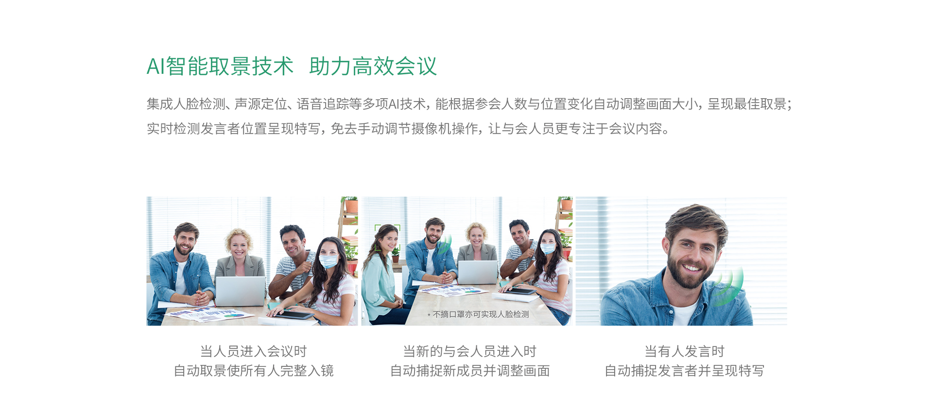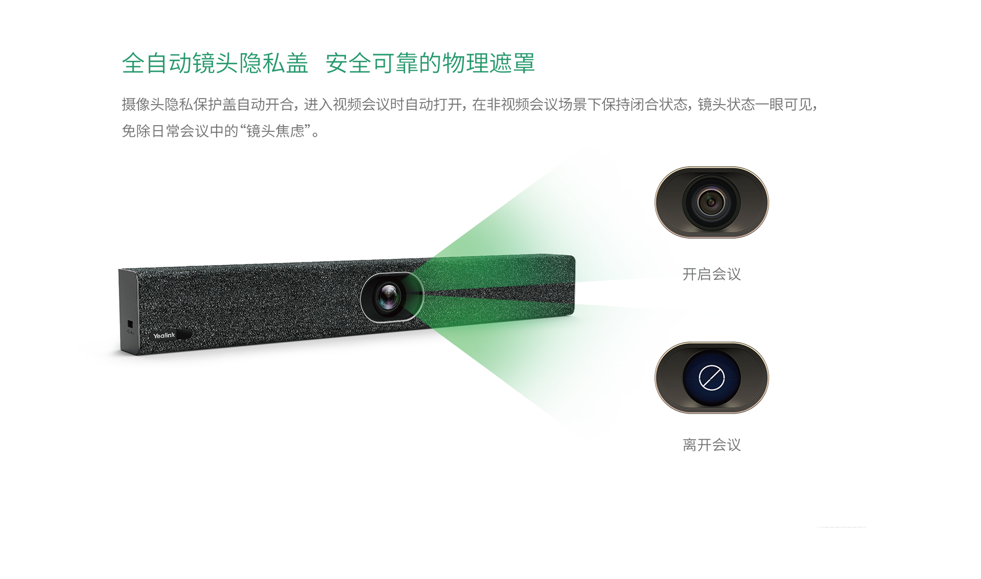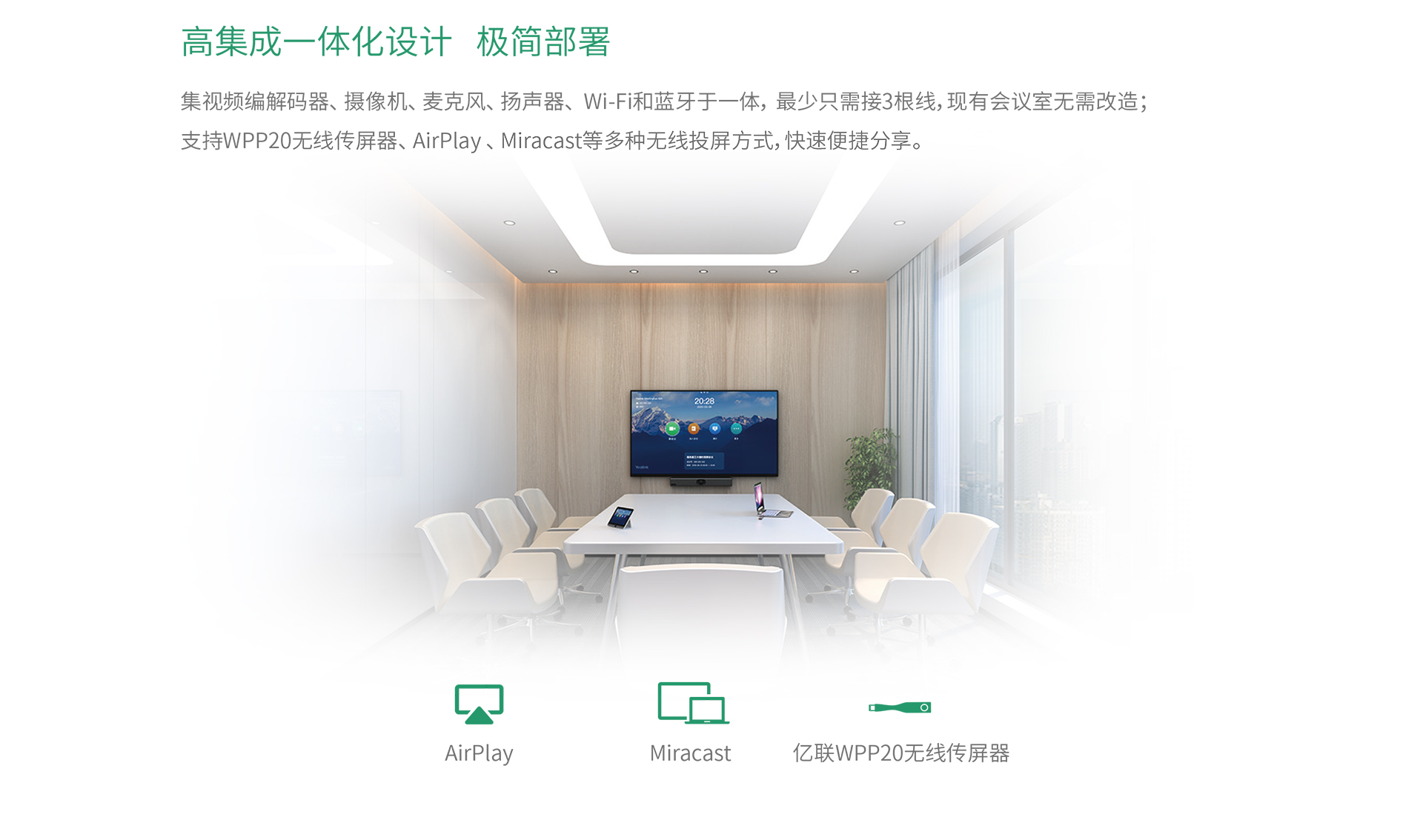 視訊終端MeetingEye 400,采用2000萬像素鏡頭,擁有133°超大視角, 支持雙4K超清視頻通話和內容分享,提供優質的視頻通話體驗;支持人臉檢測、 聲源定位、語音追蹤等多項AI技術,搭配全自動鏡頭隱私蓋,提供更智能更安全的會議體驗。MeetingEye 400采用一體化設計,支持多種無線投屏技術,精簡布線,化繁為簡,是小型會議室的理想之選。