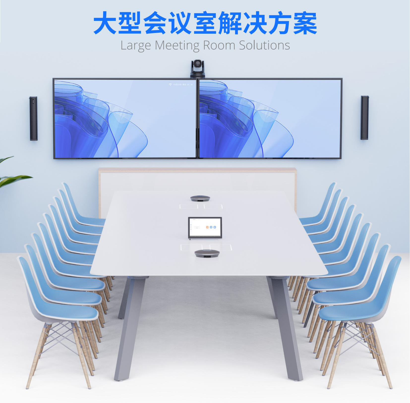 • 專為60㎡-120㎡大型會議室空間打造的云視頻會議Rooms解決方案,適用于少于25人的會議空間。該方案采用了80.6° 超廣水平視角的12倍光學變焦的4K超高清視頻會議攝像機,支持機械云臺,水平范圍±170°,垂直范圍-30°-90°,可輸 出超高清的至臻視頻。搭配最大可級聯6臺的數字陣列麥克風,根據不同會議室布局進行靈活部署,拾音范圍可達150㎡ 以上;搭配獨立的大功率揚聲器,滿足大型會場的音頻功放需要。結合會議主機預裝的云視頻會議Rooms客戶端,為大 型企業遠程會議帶高標準、更專業、沉浸式的視聽體驗