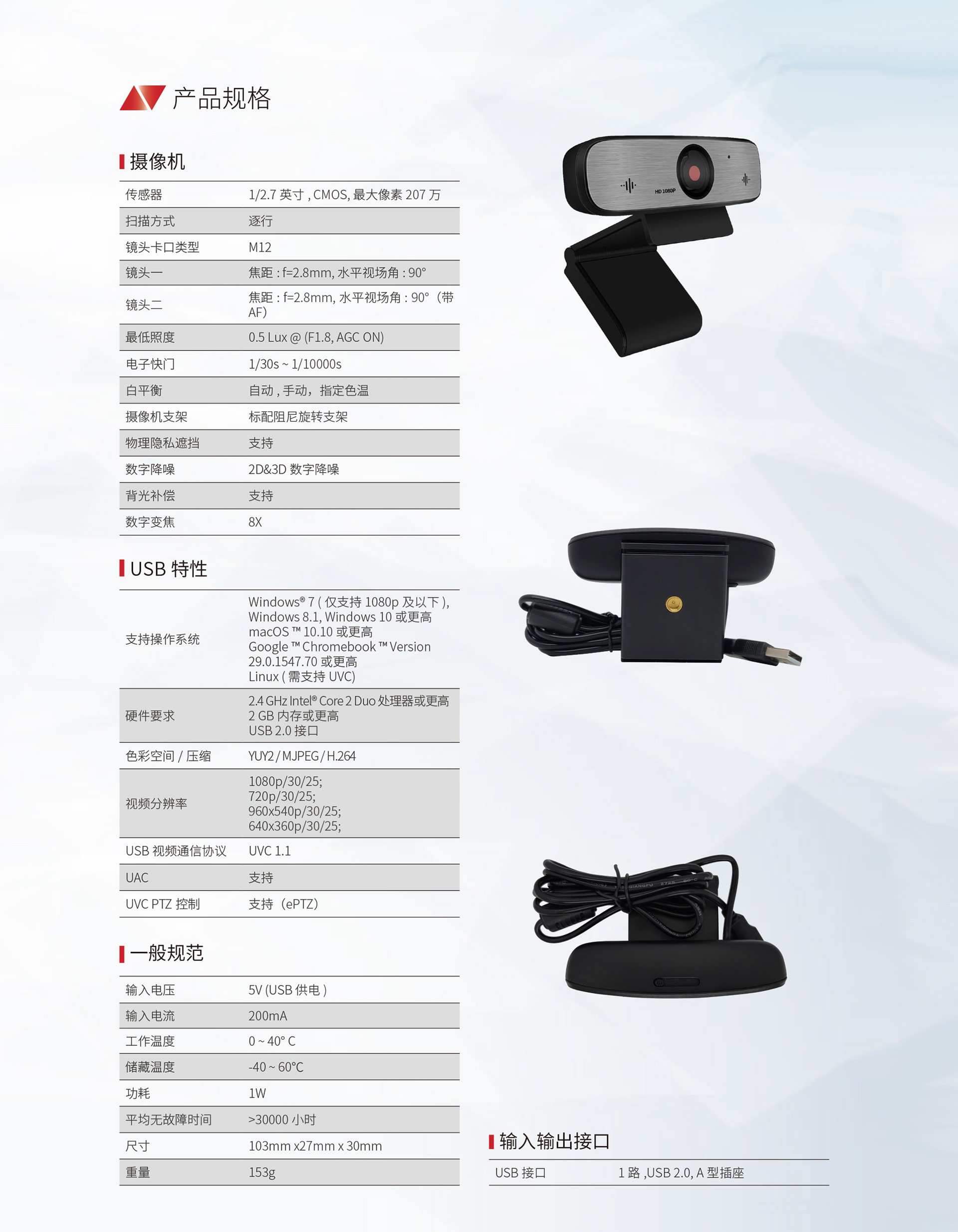全功能 USB 2.0 接口,供電、視頻、音頻于一體。